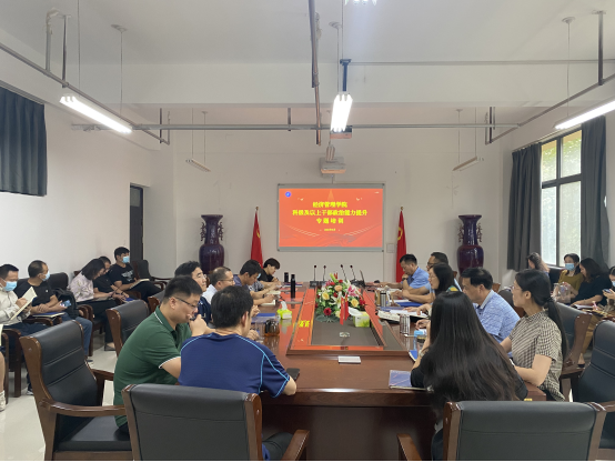 在A306会议室举行科级及以上干部政治能力提升专题培训。学院党委书记孙敬霞主持,学院领导班子、科级干部、系部主任、支部书记参加培训。