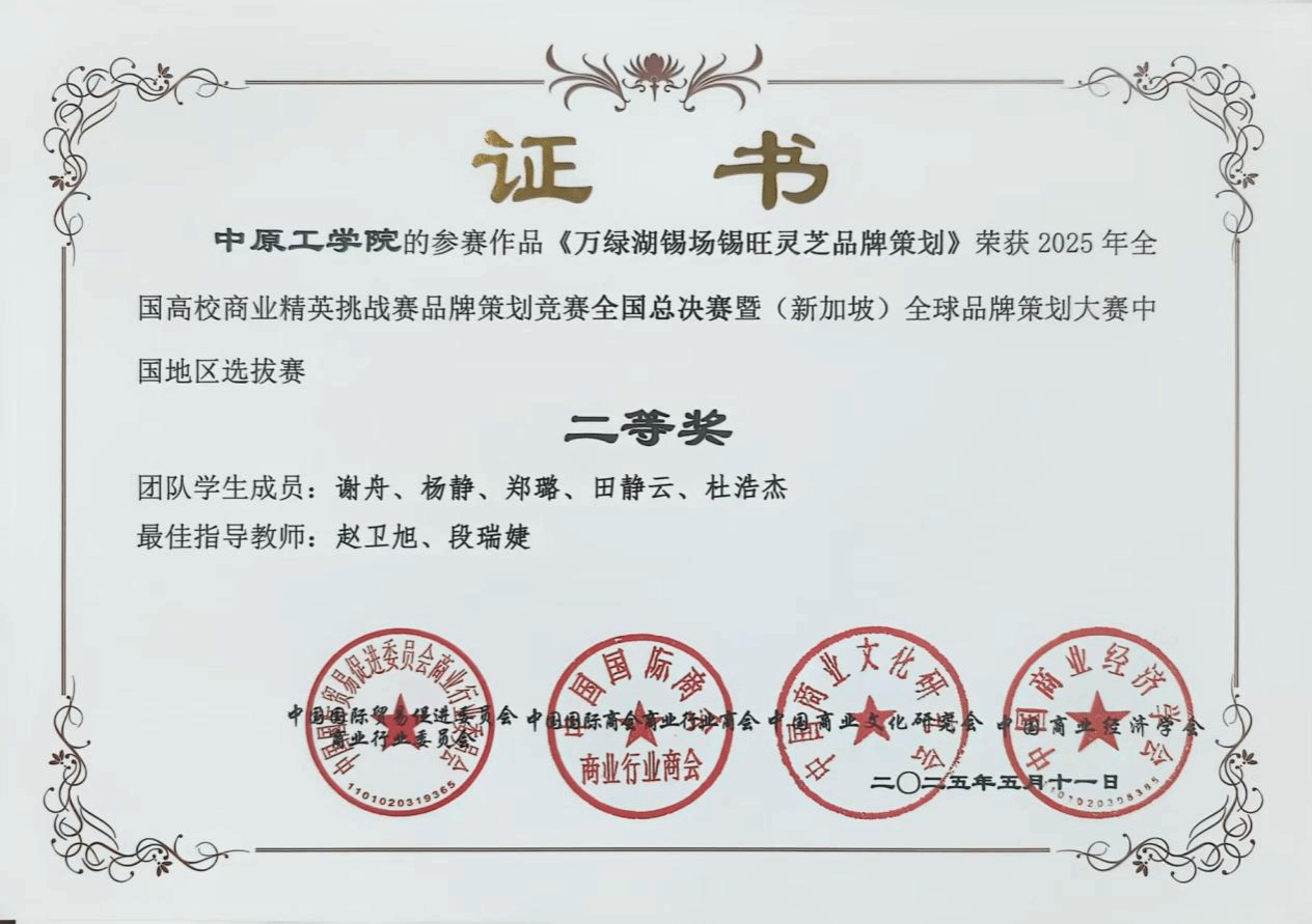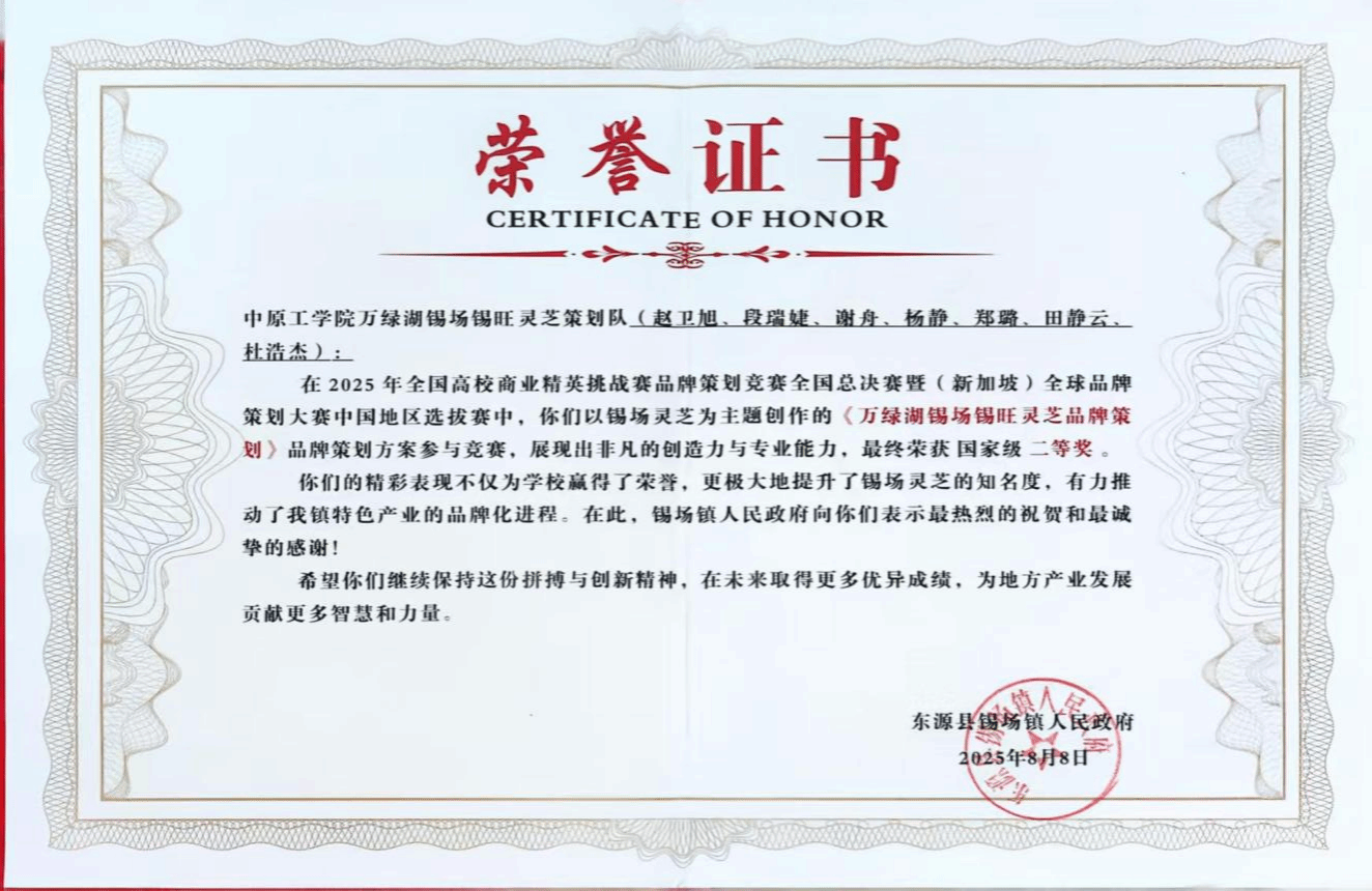 赵卫旭、段瑞捷两位老师带领学生团队(谢舟、杨静、郑璐、田静云、杜浩杰),为广东省河源市锡场锡旺农业发展有限公司量身打造的《万绿湖锡场锡旺灵芝品牌策划》方案,凭借创新实践价值斩获全国二等奖,东源县锡场镇人民政府同步为团队颁发荣誉证书,表彰该团队对当地灵芝产业品牌化发展的突出贡献。