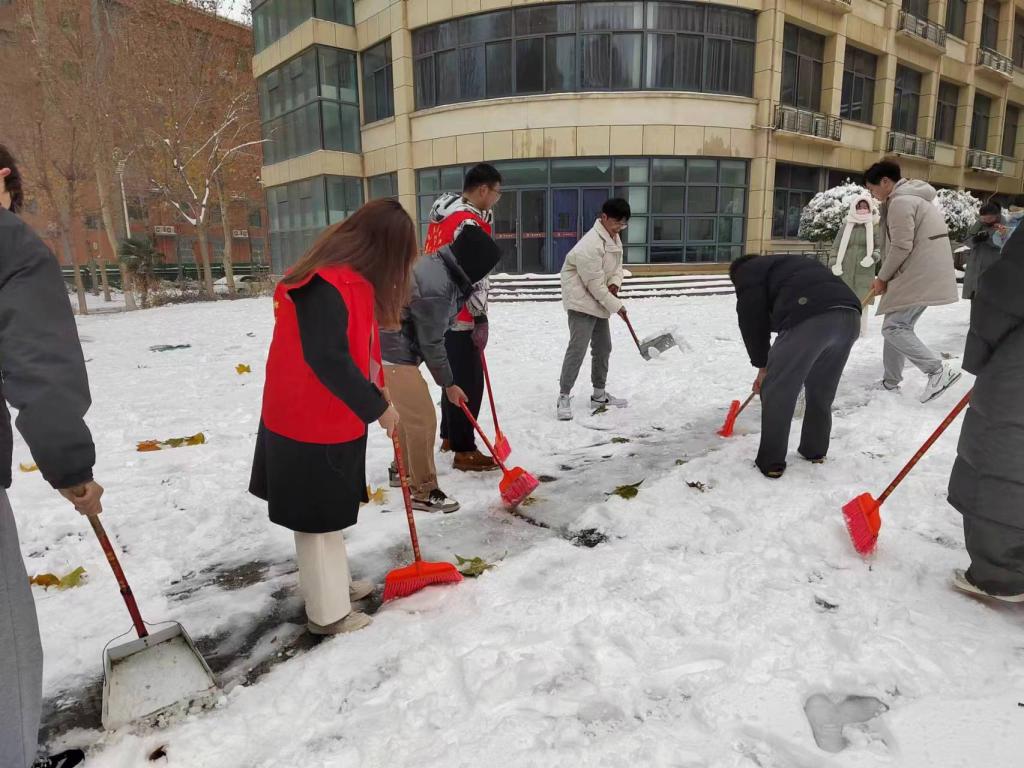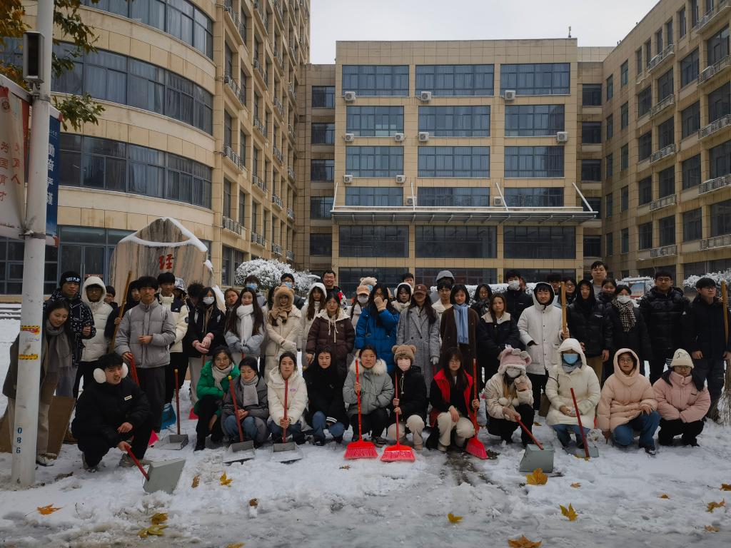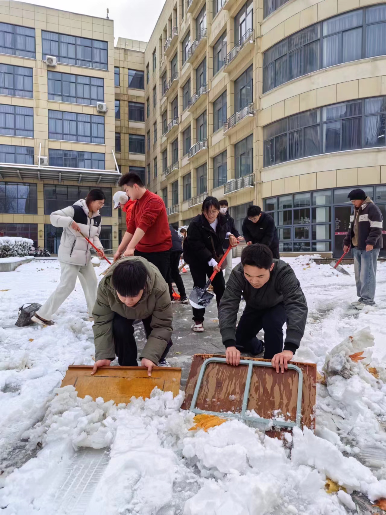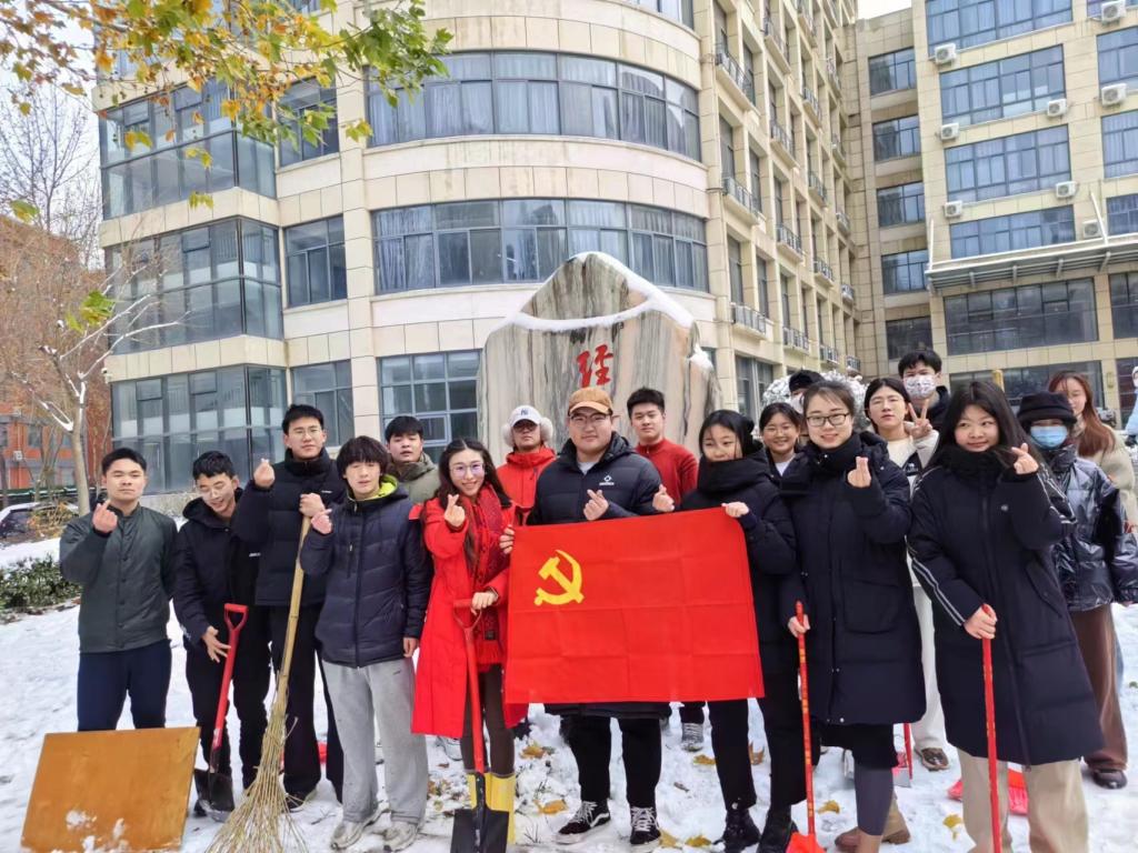 学生党支部书记杨文乐、陈金、郭政良带领本科生学生党员积极开展了扫雪除冰保畅通工作。