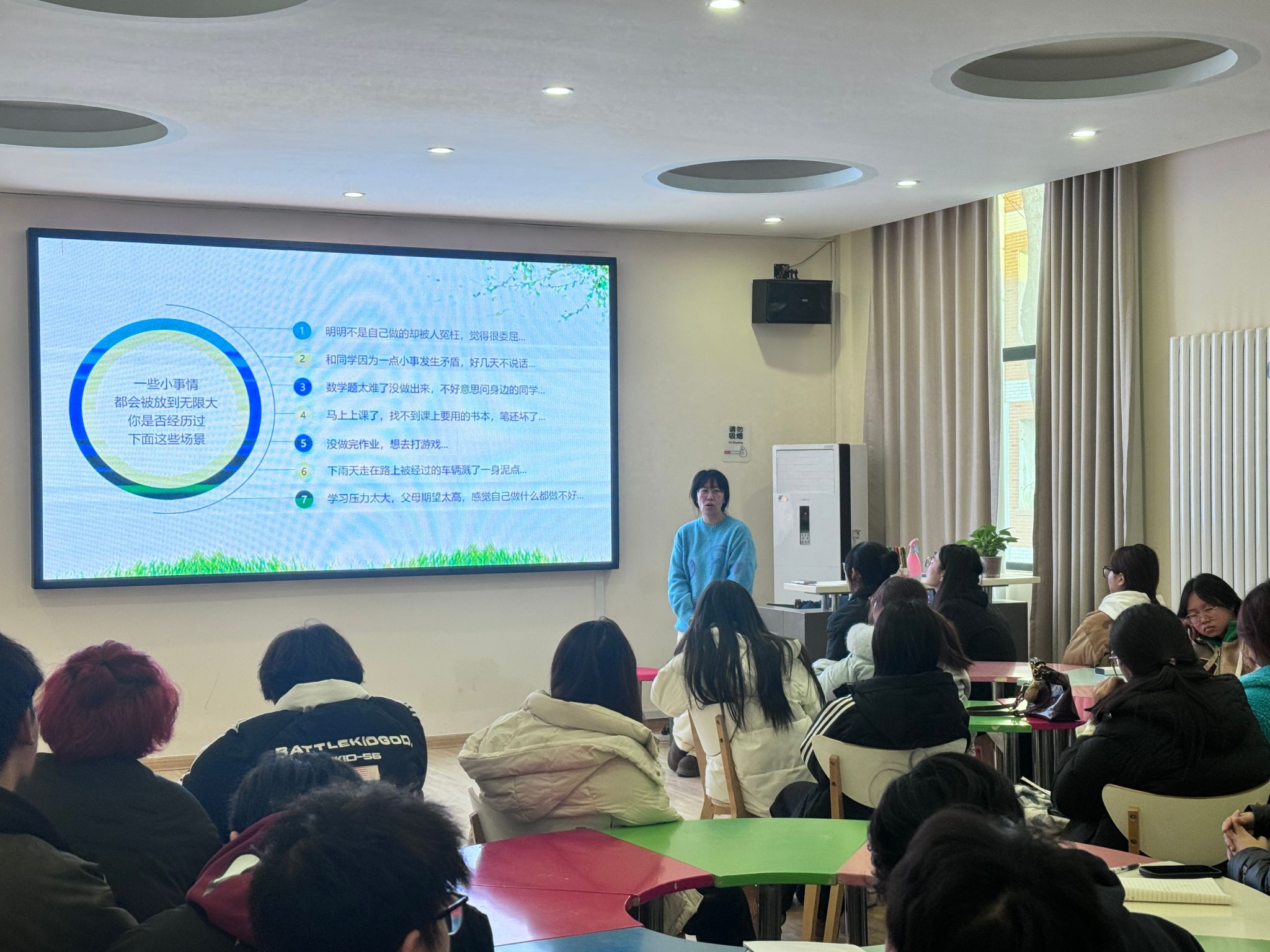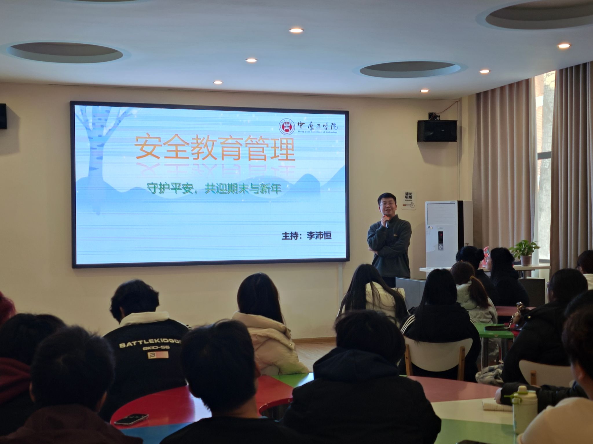 5位辅导员分别对五个板块的内容进行讲述。通过历年学生违规案例给学生敲响警钟、消防视频普及安全知识、分类讲解诈骗手段提升防骗意识、分享学风建设措施和机制使学风建设落得实处、普及心理健康知识使学生了解求助方式和途径。学生干部们都专注聆听,收获满满。