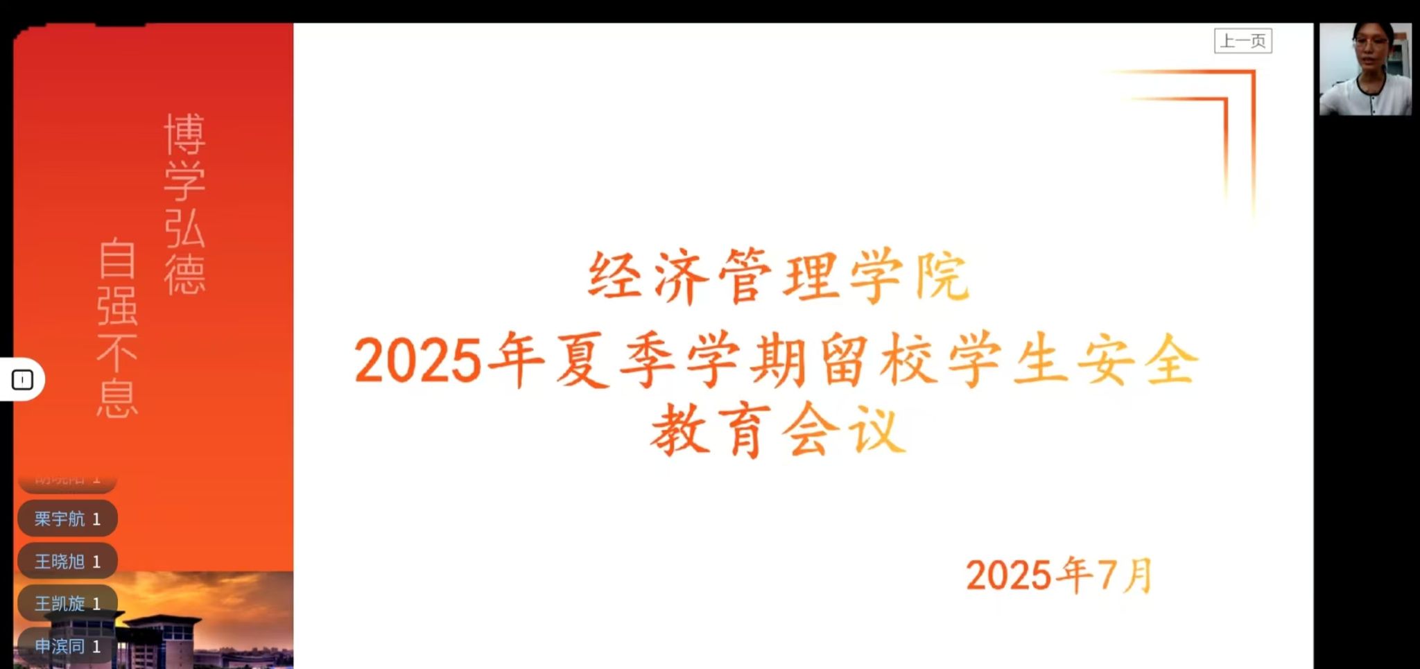 于线上召开2025年夏季学期留校学生安全教育专题会议。学院党委副书记王琳,学生工作办公室副主任陈金以及全体夏季学期留校学生参加会议。