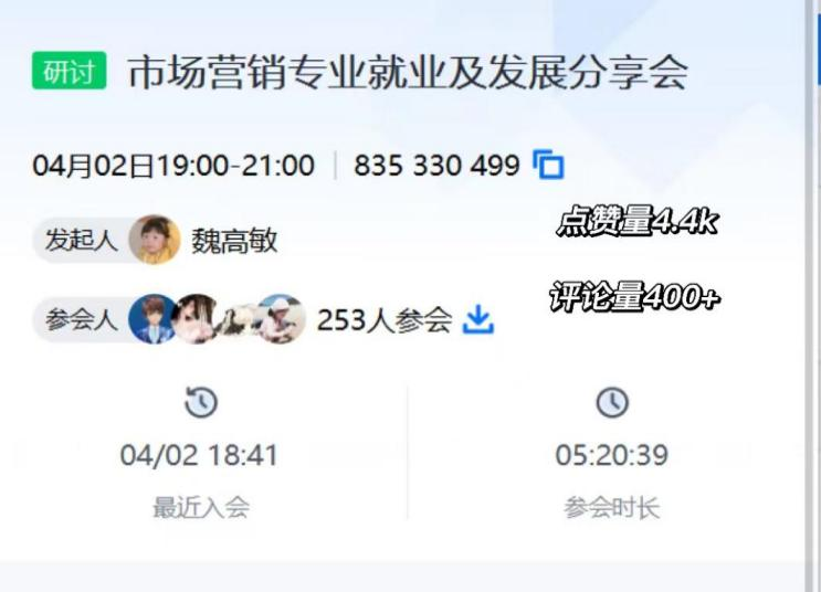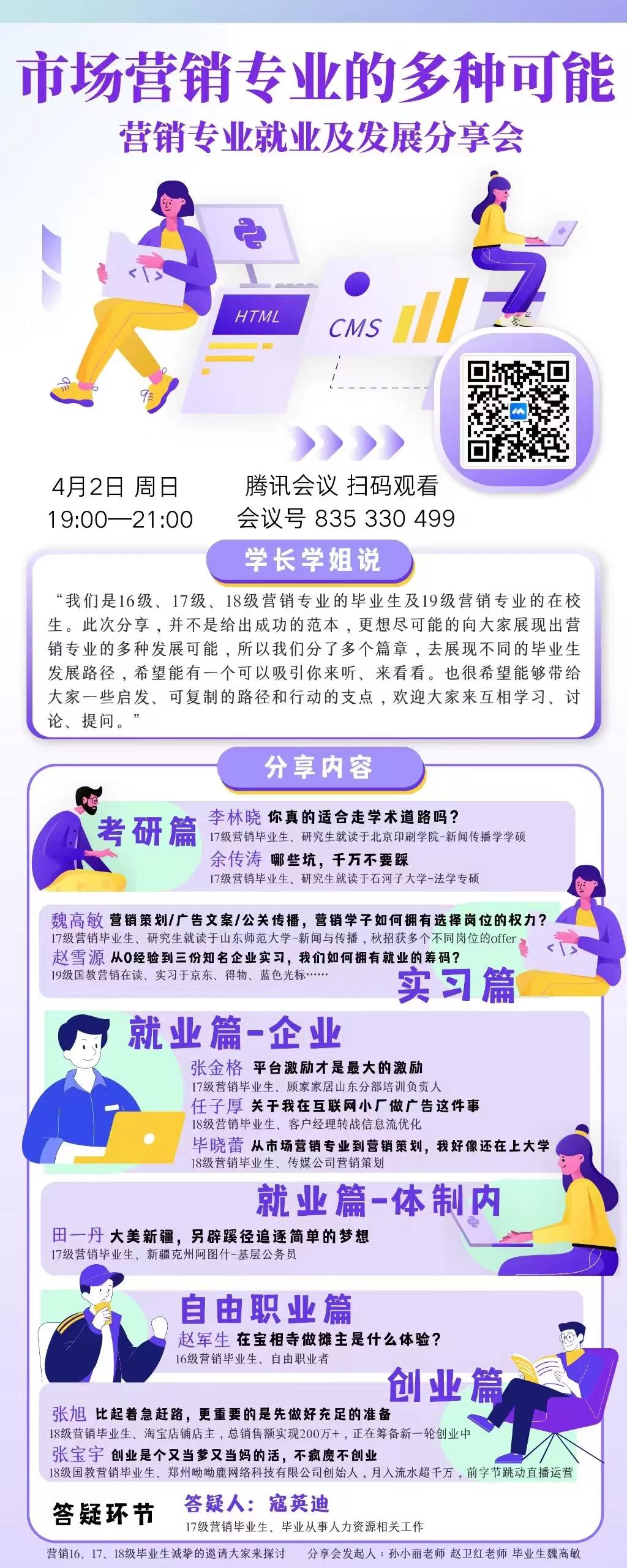 市场营销专业13位校友与在校生通过腾讯会议进行了就业创业在线经验分享和交流。学院党委副书记王琳、团委书记郭姗、市场营销系主任赵卫红、副主任孙小丽及200余名师生参加了此次会议。