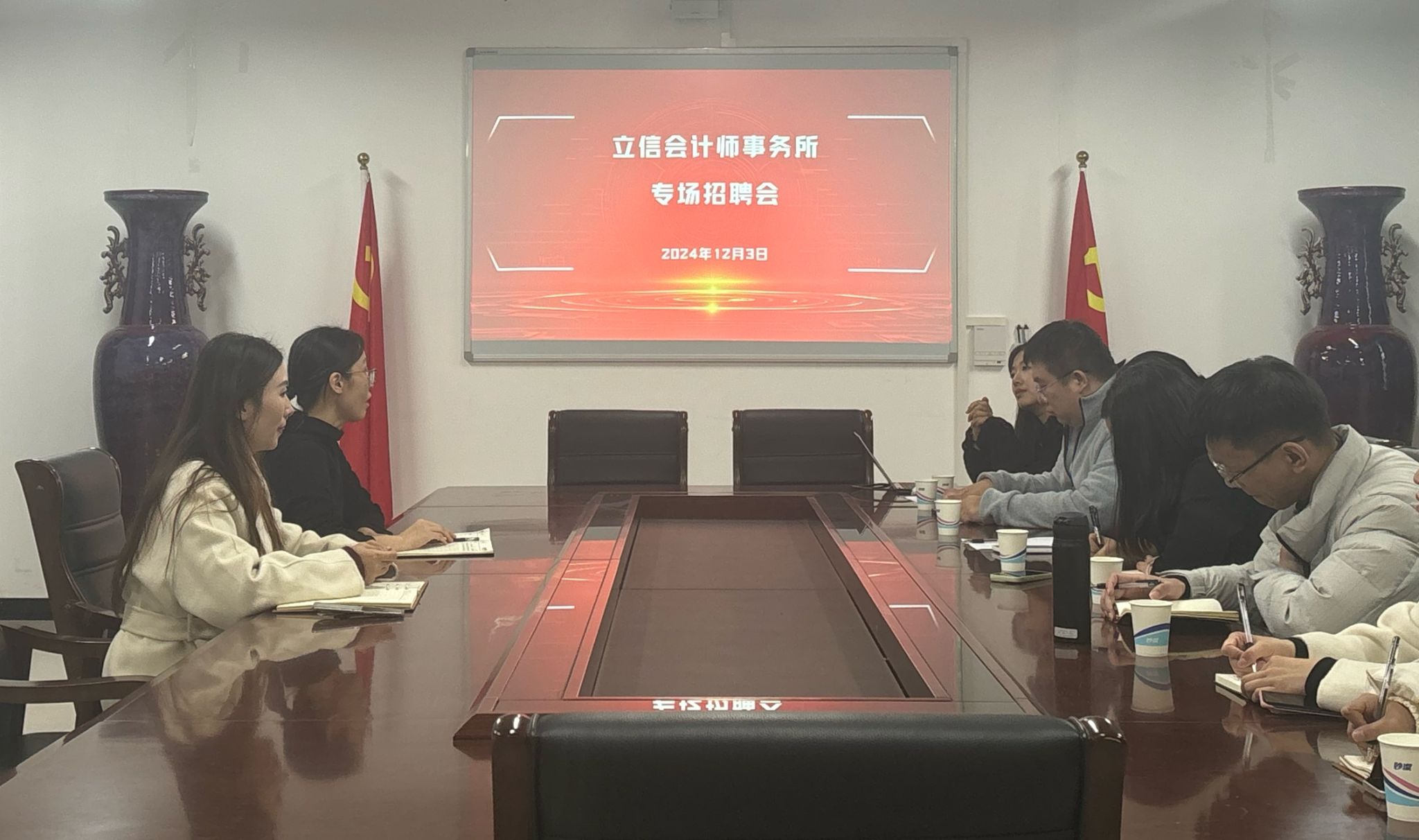 与立信会计师事务所(特殊普通合伙)在三号组团楼A306会议室召开了访企拓岗洽谈会,并于洽谈会结束后进行了专场招聘会。立信会计师事务所人事经理胡锦婷,学院党委副书记王琳、学工办主任杨文乐参加本次洽谈会。