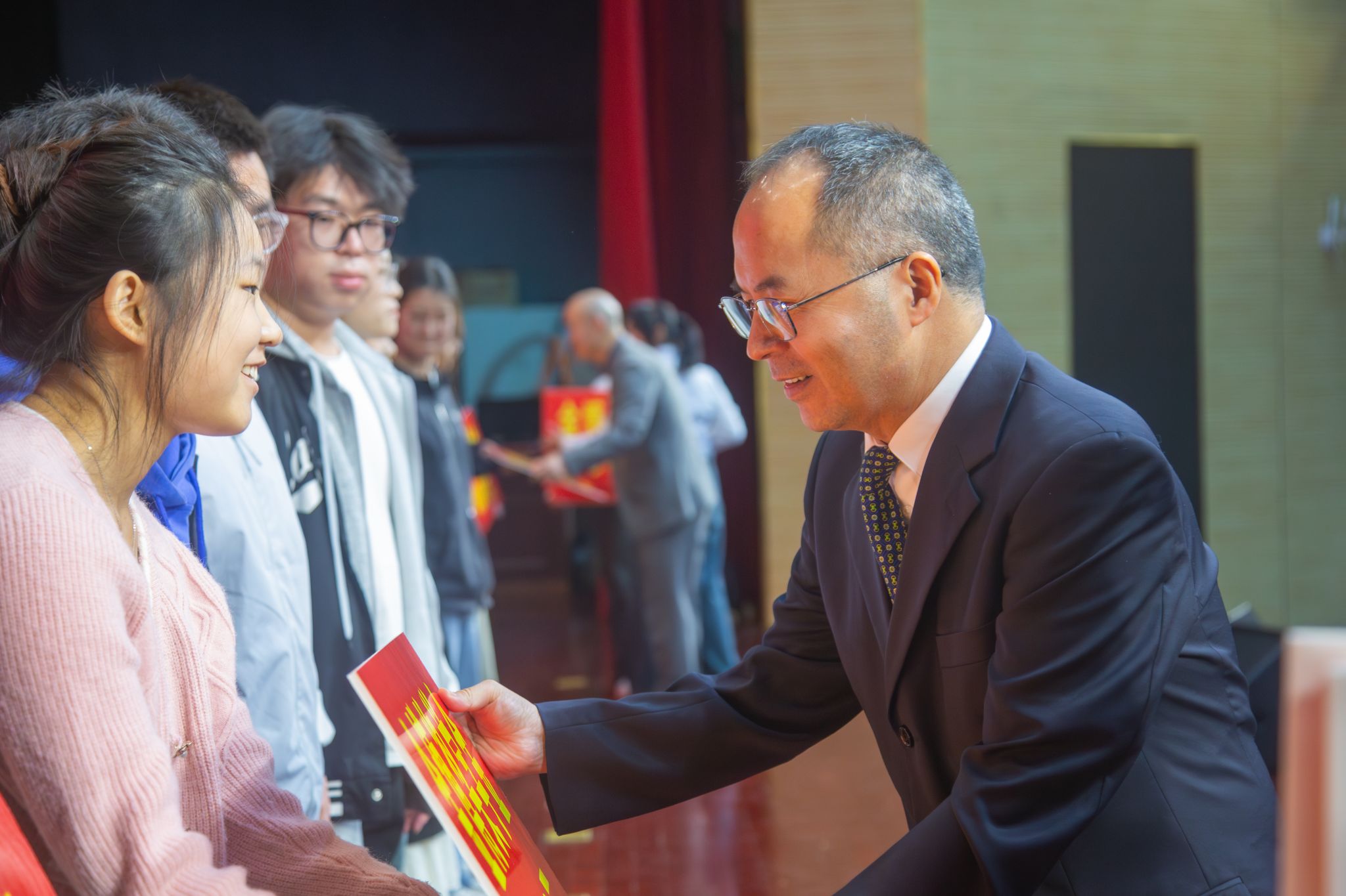 校友代表张向涛发言,鼓励同学们要努力学习,积极提升自我,遵守学校纪律,锻炼身体,成为德智体美劳全面发展的大学生。获奖学生代表色中色